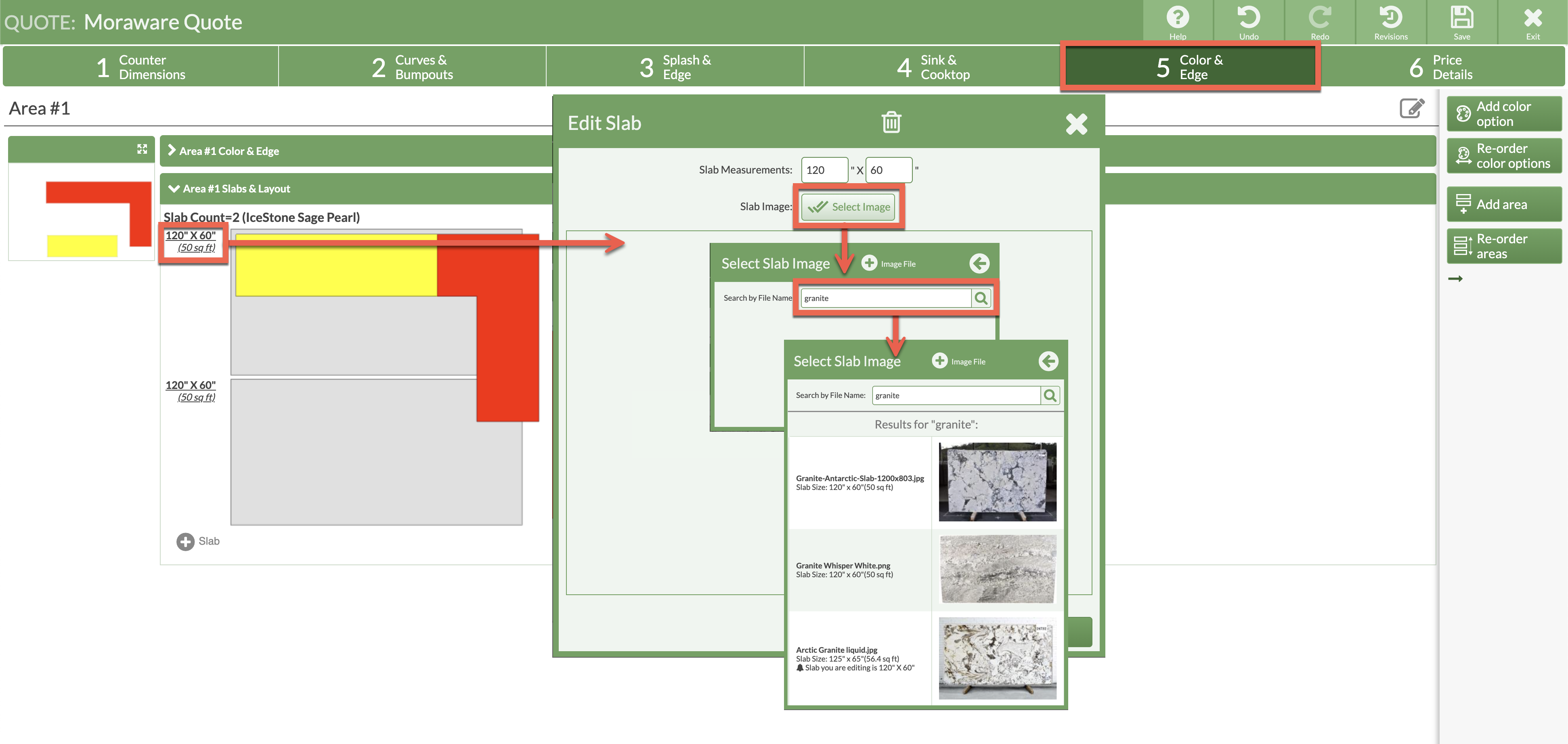 Ready to add images to your countertop drawings? Adding a Slab Image allows your customer to see an example of how the counter could look with a selected Product. You can upload new images to a Quote or Order, or search for an image previously uploaded.